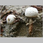 PUFFBALLS are generally spherical (some species have sterile stalks and hence are shaped more like upside-down pears) and vary from just a couple inches in diameter to, in some instances, several feet in diameter. At maturity, the entire interior of the puffball is a powdery mass of spores. Most puffballs are edible, though caution is advised to rule out button-stage Amanitas (which can be deadly!) and FALSE PUFFBALLS (which can cause gastronitestinal illness). EARTHSTAR MUSHROOMS are essentially puffballs with starlike rays radiating away from the spore case.